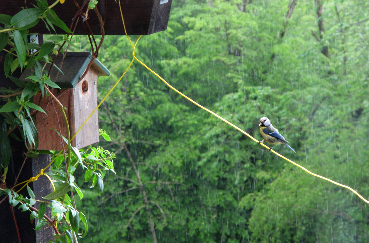 De waslijn die precies onder één van de nestkastjes hangt blijkt een prachtige tussenstop te zijn. Als één van de pimpelmezen iets te eten heeft gevonden voor de kleintjes landt hij of zij even op die waslijn, kijkt alle kanten op en ‘floept’ naar binnen. En na hooguit vijf seconden vliegt de ‘gestresste’ ouder weer naar buiten, op zoek naar nog meer lekkers. En dat gaat de hele dag zo door!