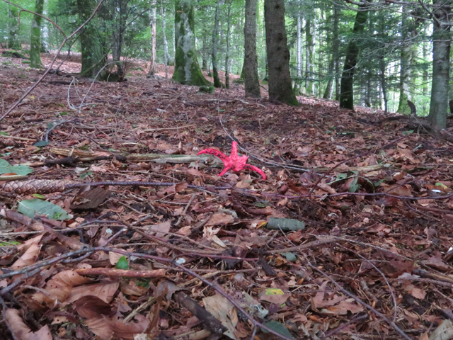 Van verre zie ik al het surrealistische rood van de inktviszwam. Hij is prachtig, buitenaards mooi! Ook al mist hij een halve tentakel. Is er toch al weer zo’n snoeperd langs geweest. De inktviszwam is een stinkzwammensoort en dat kun je ruiken, maar gelukkig biedt de lekkere vochtige bosgeur een mooi tegenwicht.
