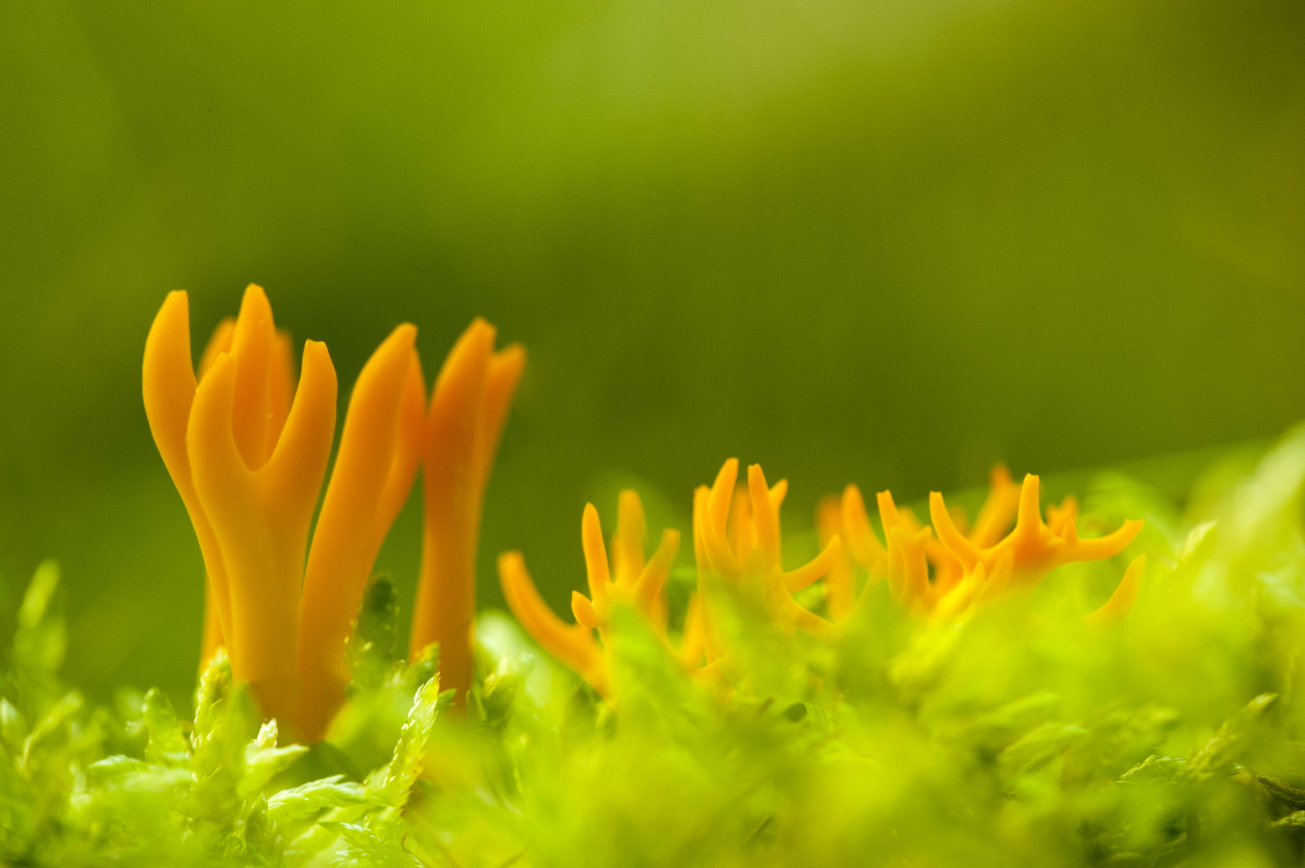 • De meest fotogenieke oranjegele paddenstoel is de koraalzwam. Dit piepkleine zwammetje kun je het beste vanaf de grond fotograferen. Je kunt eventueel je camera een centimeter ingraven om nog lager te komen. Een uitklapbaar en draaibaar scherm op je camera is heel handig bij paddenstoelenfotografie.