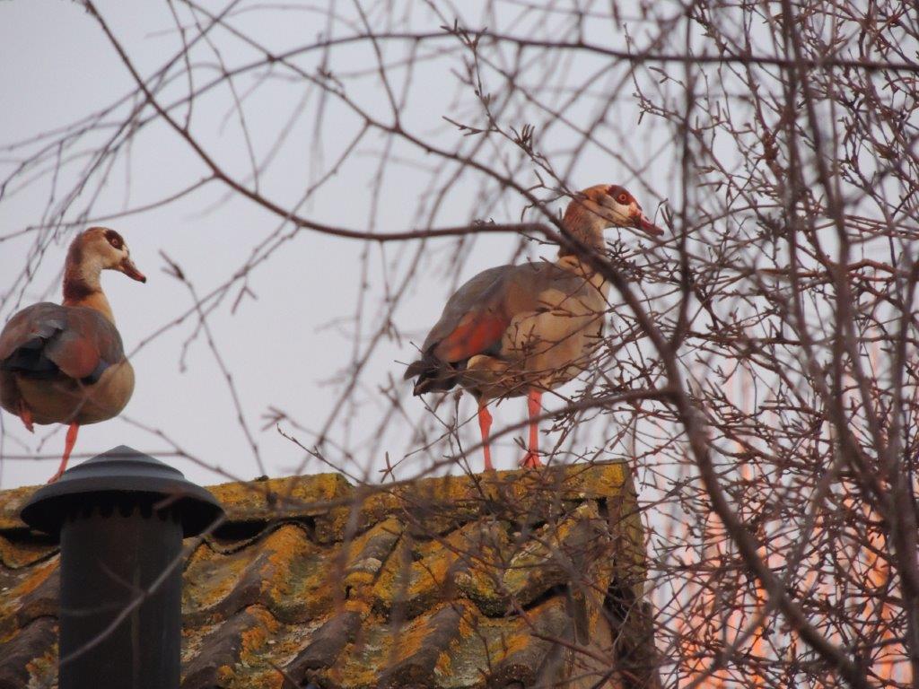 Als ik even uit het raam kijk, maak ik binnen luttele minuten kans op minstens 15 soorten vogels: merel, zanglijster, pimpel- en koolmees, houtduif, Turkse tortel, vink, putter, groenling, barmsijs, spreeuw, heggenmus, roodborst, winterkoning. Maar vooral horen we elke morgen twee lawaaiende nijlganzen en flink wat kibbelende kauwen. De laatste twee soorten zijn flink luidruchtig en ze maken elkaar langdurig en duidelijk zichtbaar het hof. De nijlganzen kiezen daarvoor niet zelden de nok van het huis op de hoek van de straat, de kauwen vooral het dak van ons huis en de omringende huizen.