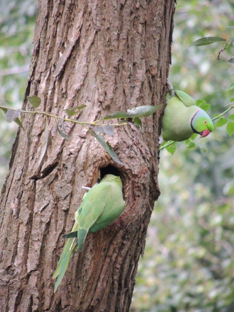 Dan ineens bedenk ik me dat ik zelf ooit een artikel heb geschreven in Grasduinen over ‘vervelende vogels’. Ik zoek het terug. In 2002! Wat zeg ik over de halsbandparkiet? “Een vogel die ons de komende jaren waarschijnlijk parten gaat spelen, is de halsbandparkiet. Waren het in de jaren ’90 nog enkele tientallen ontsnapte vogels die de stadsparken in Amsterdam, Haarlem, Den Haag en Rotterdam sierden, op dit moment kunnen we spreken van enkele honderden broedende vogels, en ’s winters plaatselijk zeker wel tegen de duizend van deze zeer luidruchtige beesten. In de winter slapen ze het liefst met z’n allen bij elkaar op een slaapplaats, bij voorkeur in een park. Ze maken dan niet alleen een immens kabaal, ’s zomers bezetten ze ook nog eens veel nestholen van de boomklever en specht. In hoeverre dit schade oplevert voor deze inheemse vogel in nog onbekend. Wordt vervolgd! “