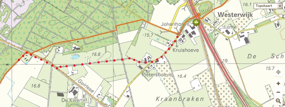 - Op heuveltop en op kruising LA. Volg karrenspoor, dat later naar rechts afbuigt. Op kruising bij oude Koningseik RD en na 250 m RA op T-splitsing. Sla na twee bochten op kruising LA, volg grindweg. Volg deze grindweg alsmaar RD (je passeert poel ‘Ruitersgat’). Wandel na wildrooster langs parkeerterreintje tot aan autoweg (N344).