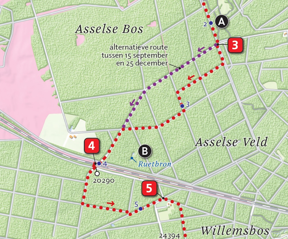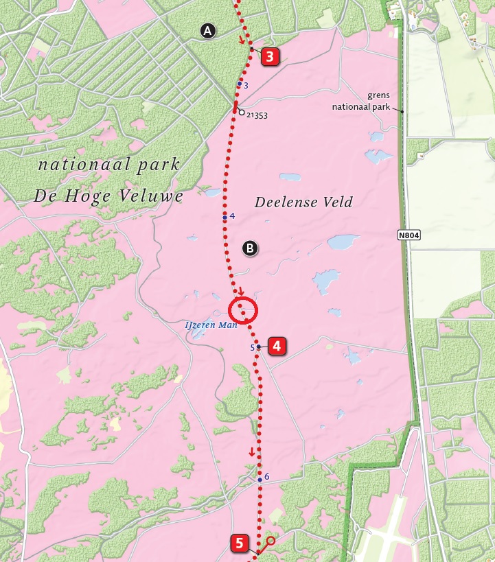 Let op: de kaart op pag. 96 is aangepast vanwege sluitingsperiode Kroondomeinen, routepunt 3 is verschoven, zie nieuwe kaart hieronder. De nieuwe routebeschrijving voor punt 3 is nu als volgt: