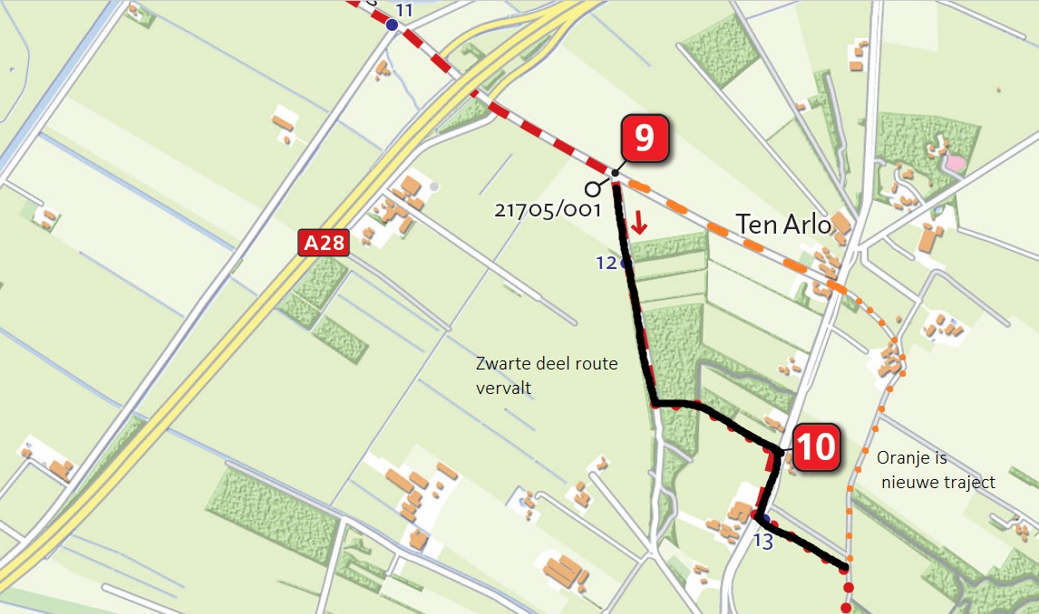 Bij routepunt 9, tweede regel, staat: 'Bij KP S23 RA, paarse pijl volgen.' KP S23 is echter verplaatst naar de N340 omdat je hier niet meer RA af mag. Oplossing: loop RD naar de N340 op de kaart en sla RA. Bij KP S23 RD en loop door tot de weg Op 't Holt aan je rechterhand. Lees verder bij routepunt 10.