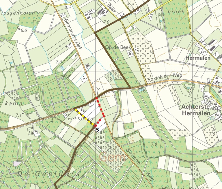 Het stuk tussen de A50 en punt 3 is soms zeer nat of de paden zijn overwoekerd. Neem dan vanaf km-punt 5, de Achterdijk naar punt 3.