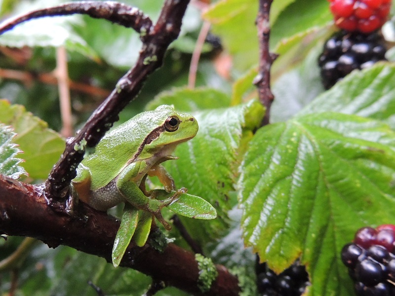 Als we klaar zijn met de route, rijden we een stukje in de dienstauto door het middengedeelte van dit fraaie duingebied richting Pannenland om er nog even samen wat te drinken. “Mag ik je nog iets vragen, Gerard.” Ik zie op Facebook steeds van die mooie foto’s voorbijkomen van boomkikkers hier in de duinen. Weet jij waar dit is, en kunnen we daar misschien even langsgaan?” Even later staan we in de nimmer aflatende regen in een braamstruik te gluren, waar Scholten ze slechts een keer eerder heeft gezien. “Ze zijn minuscuul klein, en als het regent verschuilen ze zich vooral onder de bladeren.” Een hopeloze opdracht dus?