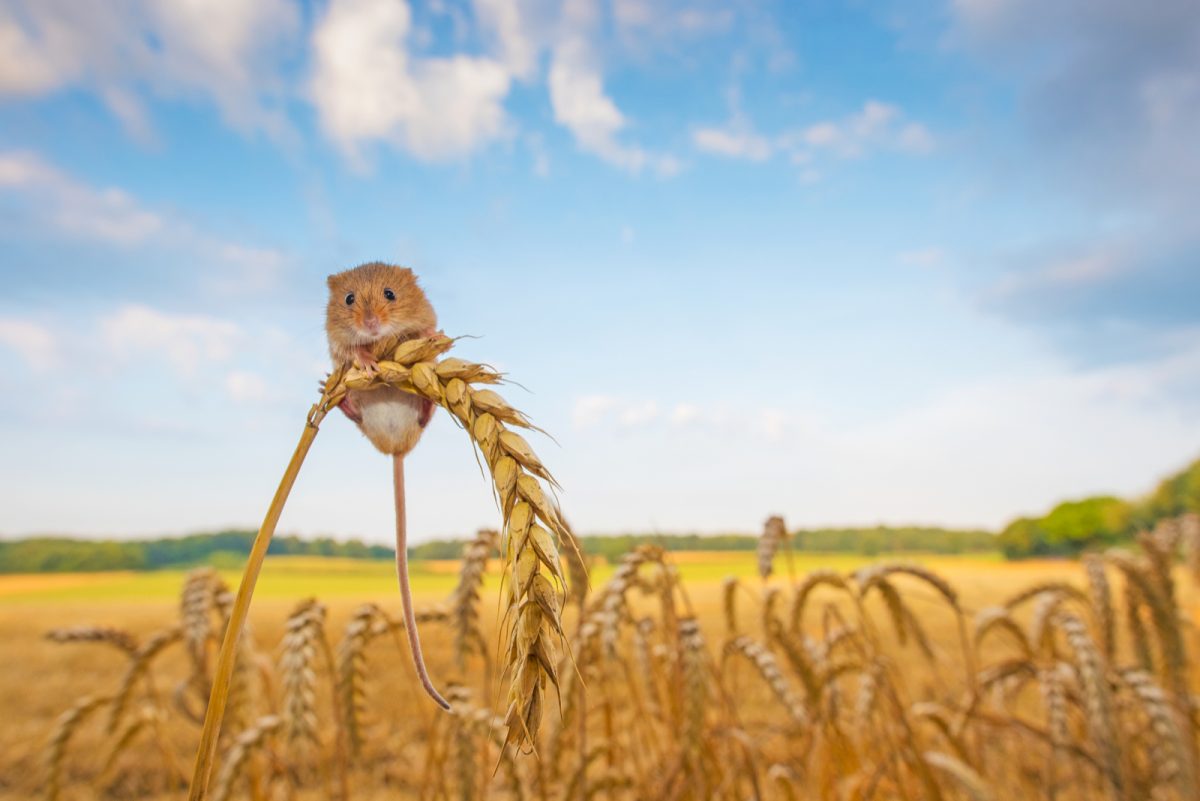 In het allerlaatste avondlicht op een warme zomeravond wipt een minuscuul, oranjebruin, harig bolletje met kleine kraaloogjes behendig van de ene korenhalm naar de andere. In de zomermaanden leeft de dwergmuis vooral daar, hogerop in de begroeiing. Met speels gemak tussen de stengels navigerend, zijn lange soepele grijpstaart gebruikend als extra grijporgaan, ziet het kleinste knagertje van Europa in deze tijd van het jaar zelden de grond.