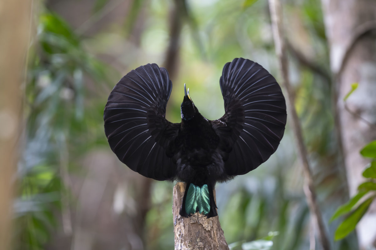Male Victoria’s Riflebird (Lophorina victoriae), a Bird-of-Partadise (Family Paradisaea), native to the Atherton Tableland in Queensland, Australia, in his elaborate courtship display.