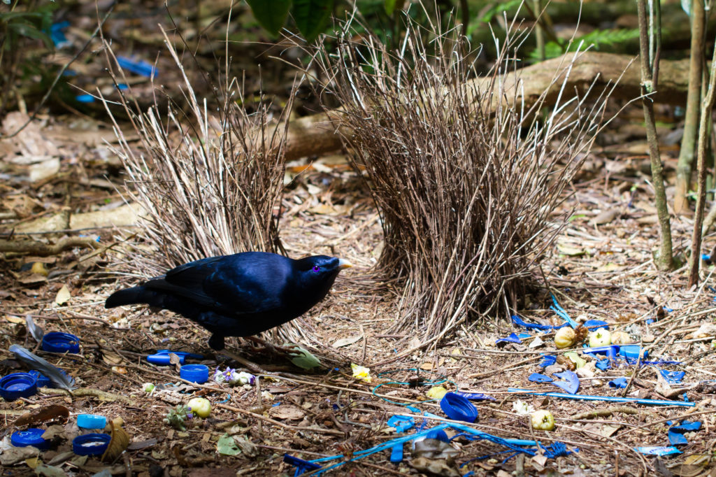 Het prieeltje van de satijnblauwe prieelvogel, versierd met blauwe accessoires. Foto: Getty Images