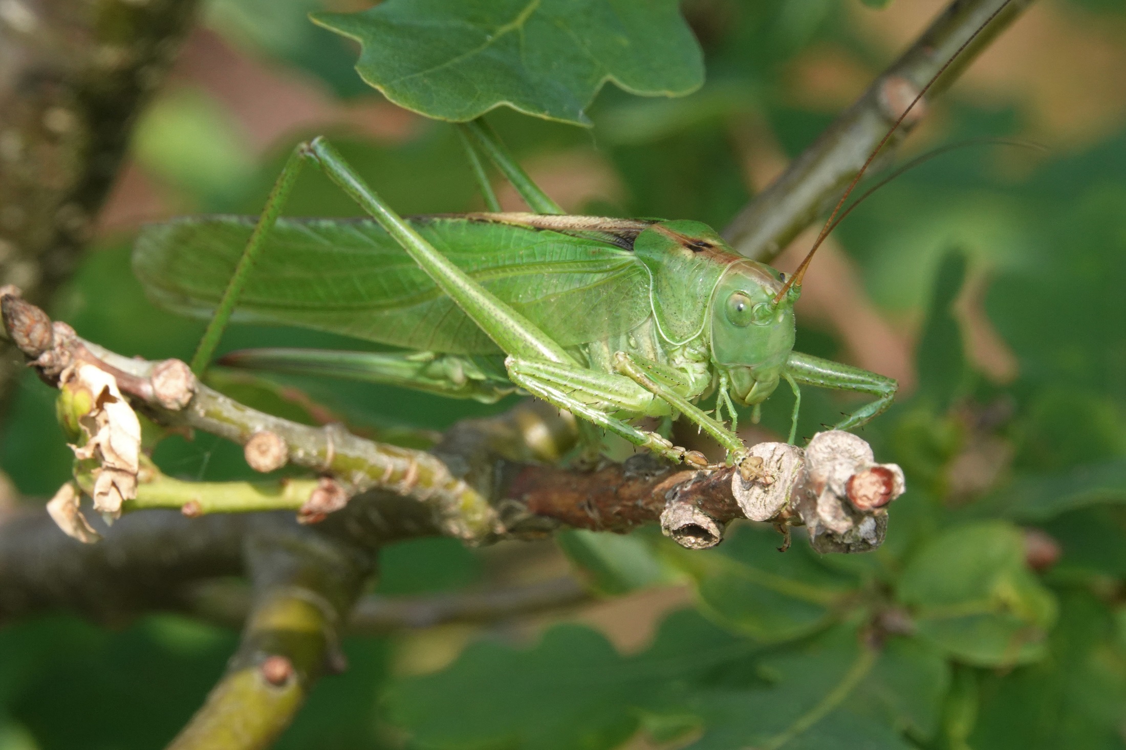 - Luister naar het geluid van de grote groene sabelsprinkhaan (klik rechtsboven op geluid).