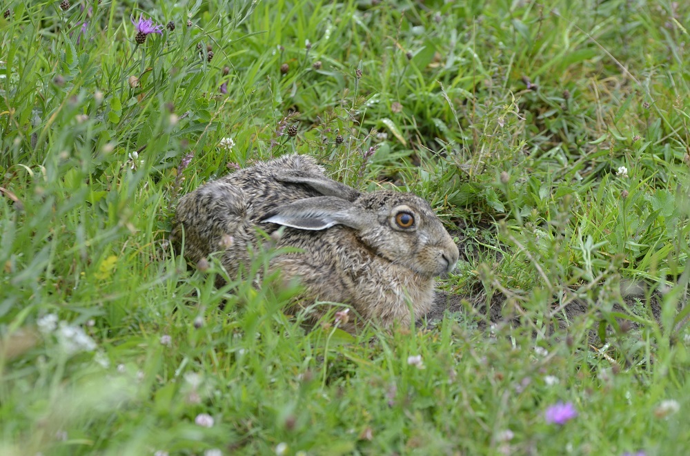Terug naar de foto, want dat maakt het nog moeilijker. Je weet immers niet waar hij genomen is. Een biotoop kan al een en ander uitsluiten. Uiteindelijk hebben we de foto opgestuurd naar konijnen en hazen-kenner Jasja Dekker. Maar ook voor Jasja was het nog even puzzelen (en gelukkig maar, als het appeltje eitje zou zijn, stonden wij als redactie behoorlijk in ons hemd). Zijn antwoord: “Jeetje! Ik vind het ook wel heel moeilijk, maar ik denk toch een (oud) konijn. Op de foto zijn de oren te kort voor een haas. Hij heeft inderdaad een bonkige kop, maar grote mannelijke konijnen hebben dat. Geen lichte vlekken op de kop, dat hebben hazen meestal wel. En de tekening op de oren van hazen is veel sterker dan bij konijnen… Het konijn lijkt vaak donkerder ogen te hebben inderdaad, maar ze hebben allebei gewoon een ring. Die van de haas vind ik altijd lichter, meer amber dan bruin. Maar zie mijn eigen foto voor een konijnenoog, met iris!”