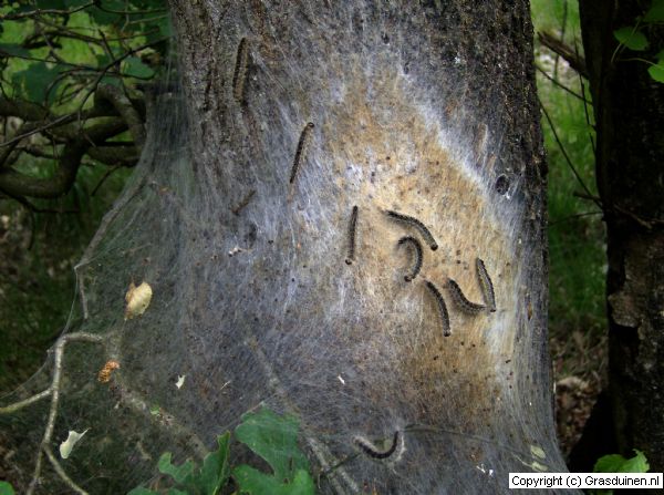 De rupsennesten in de nestkastenlocatie blijken ook veel kleiner. Dat komt doordat ze flink in hun ontwikkeling gestoord worden als de mezen er rondscharrelen. In de proeflocatie werden de rupsennesten niet groter dan 20 cm. Op de locatie zonder mezenkasten werden de rupsennesten wel 1 meter!