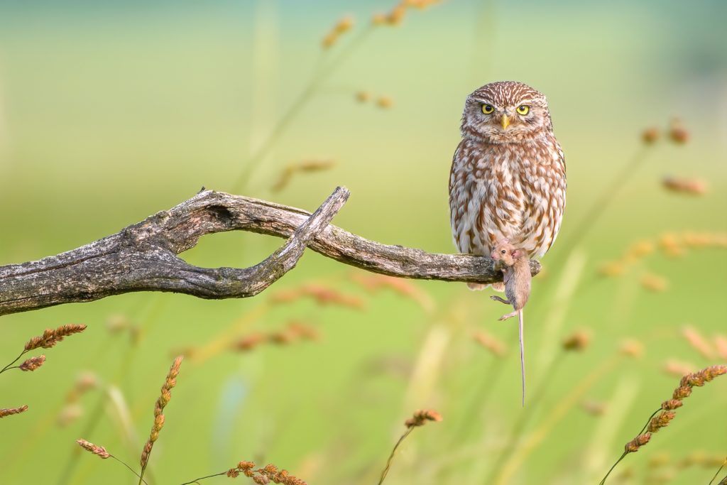 Steenuil met prooi – Andy Vandersteen. Mooi licht en een prima positie van de uil, op 2/3 van de breedte.