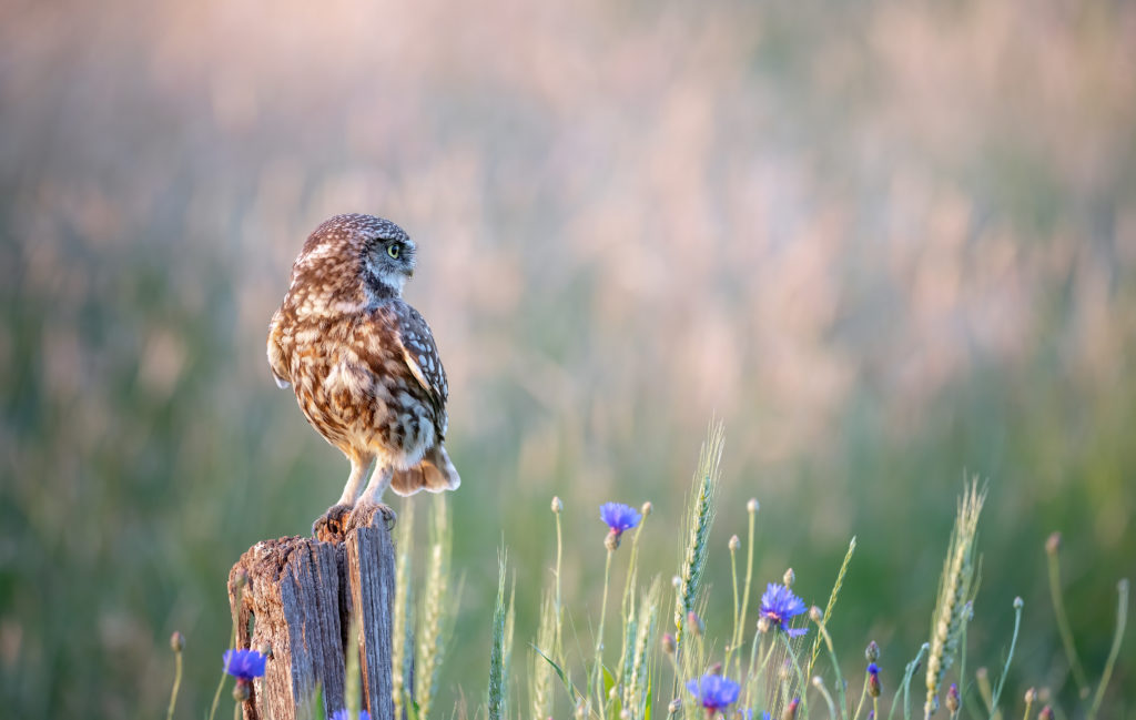 Steenuil op de uitkijk – Ines Jonkers. Mooi licht, mooie houding, de korenbloemen maken de foto áf.