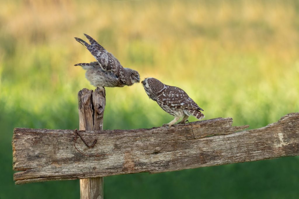 Steenuil met jong – Miranda de Vries. Mooie weergave van deze interactie.