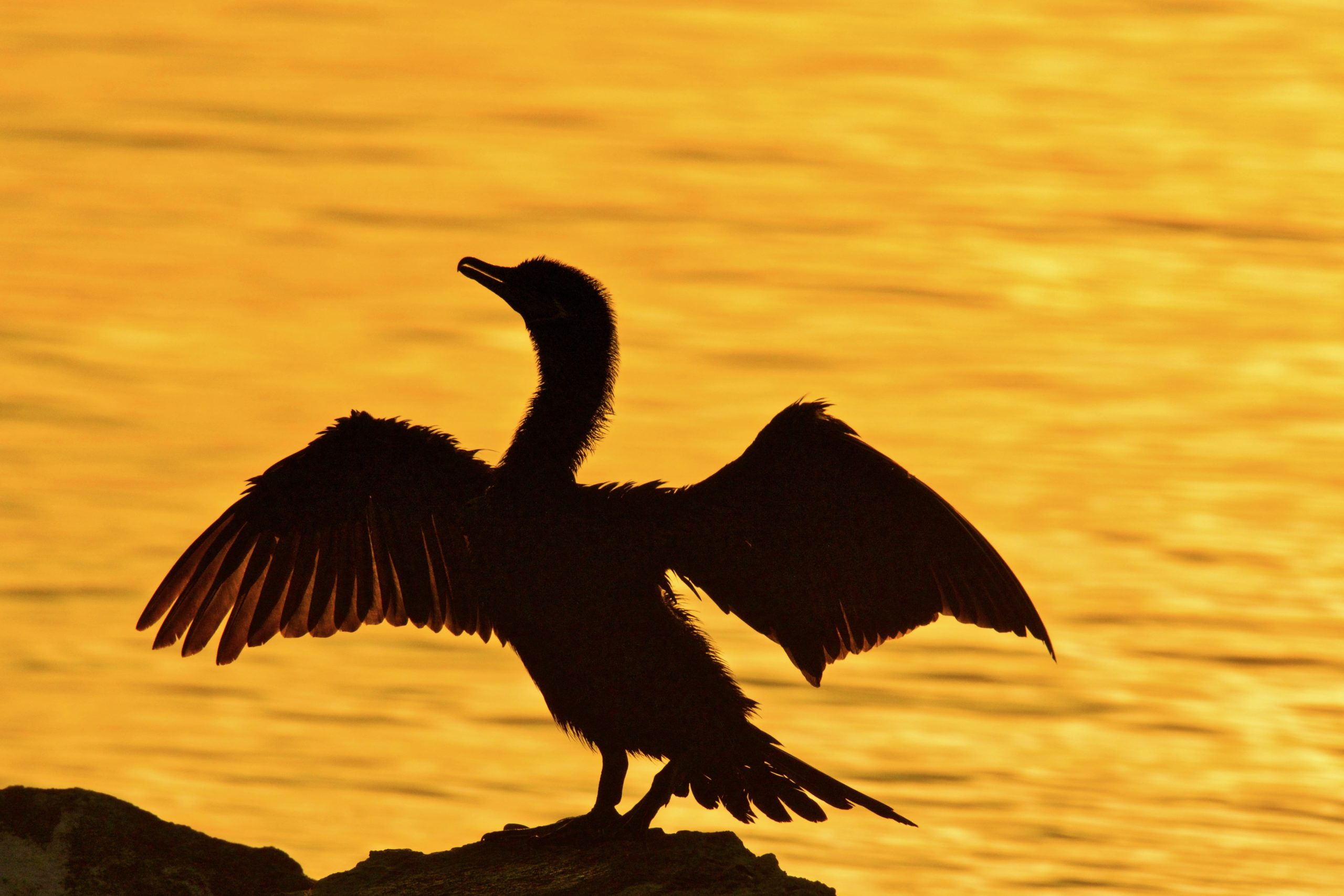“Wanneer de avond goudgele rust uitstraalt…”, deze poëtische titel gaf fotograaf Kristien van Acker aan deze foto van een aalscholver in avondlicht. Het dier droogt zijn vleugels in de goudgele avondzon. Omdat zijn veren niet zo waterafstotend zijn als bijvoorbeeld bij eenden moet de aalscholver na een duik even de “boel” laten drogen.