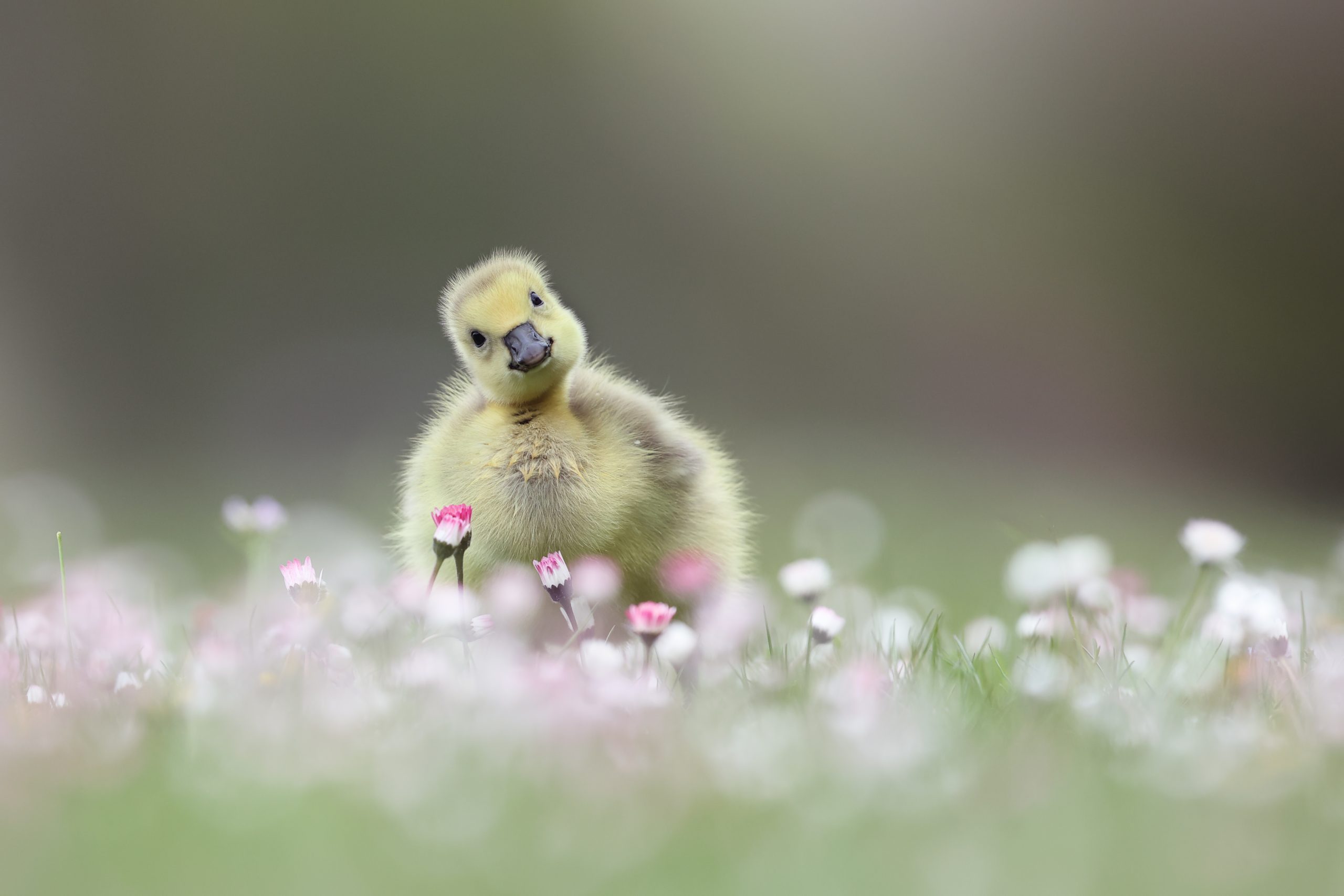 Let ook op de madeliefjes met de roze puntjes op de uiteinden van de bloemblaadjes, rondom de jonge Canadese gans