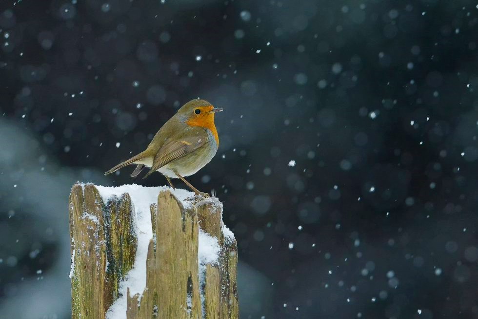 Roodborst in een sneeuwbui