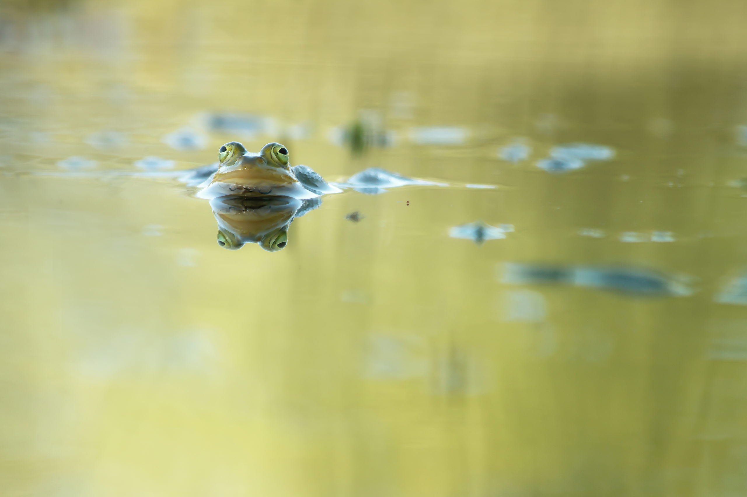 Vier kikkerogen, zo noemt Ellis Pellegrom deze foto. Deze prachtige plaat is de nieuwe Roots Foto van de Week! Het commentaar van de fotograaf: “Deze kikker begroette mij hartelijk terwijl ik op mijn buik aan de waterkant lag om op “oog”hoogte de spelende kikkers te kunnen fotograferen. De weerspiegeling van de bomen in het water zorgde voor een geel gekleurd vennetje.”
