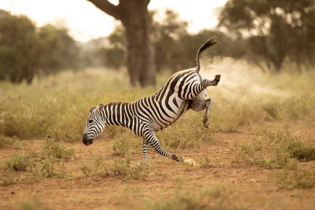 De Britse fotograaf Vince Burton maakte deze foto in Amboseli, Kenia. “Net alsof ie werd aangedreven door een scheet”, aldus Burton.