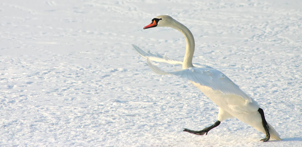 Fotograaf Bojan Bencic uit Kroatië maakte deze foto van een zwaan in Maksimir Park in Zagreb, Kroatië. Bencic: “De zwaan zat middenin een gevecht met een andere zwaan, en achtervolgde hem al lopende over het bevroren meer”.