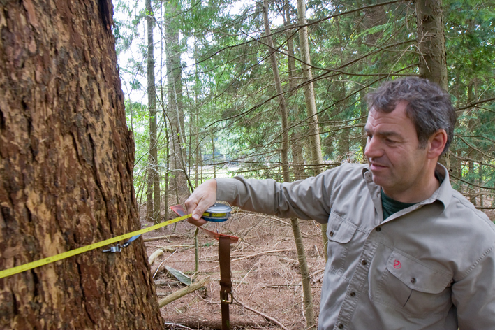 Ik vraag hoe dik de stam is. Clemens: “Geen idee.” Hij stelt voor het op te meten. Hij haalt een meetlint uit de auto en slaat die om de boom. “Je meet altijd op borsthoogte. DBH noemen we dat, diameter borsthoogte.” Ik noteer: ‘maandag 29 september, de reus die niemand ziet heeft een omtrek van 376 centimeter.’