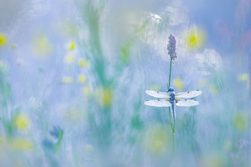 “Een viervlek op een frisse ochtend in een natte lente weide in Hauts-de-France. Haar vleugels waren bedekt met dauw terwijl ze geduldig wachtte tot de zon haar opwarmde en ze kon wegvliegen. Ik nam deze foto met tegenlicht, temidden van bloemen.”
