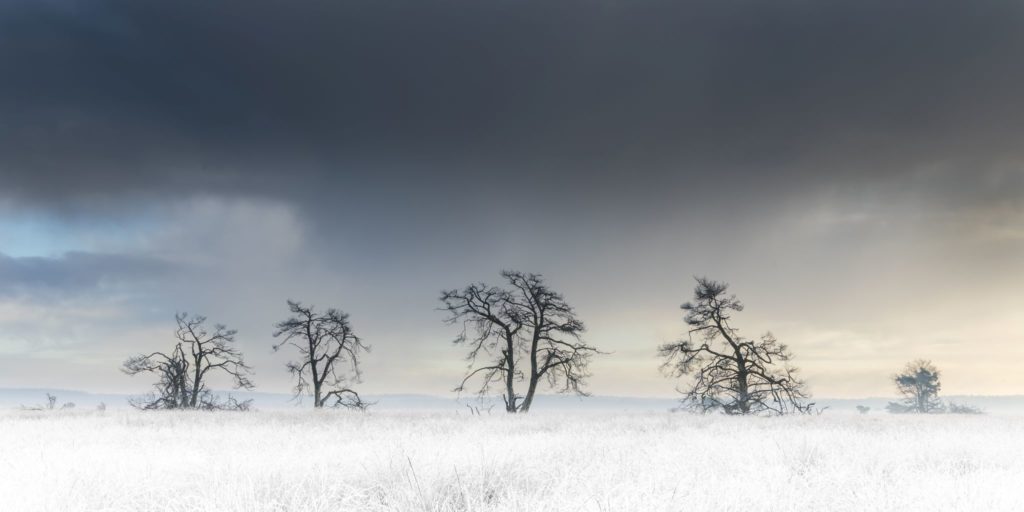 De kracht van deze foto is de symmetrische vorm van de vijf bomen.