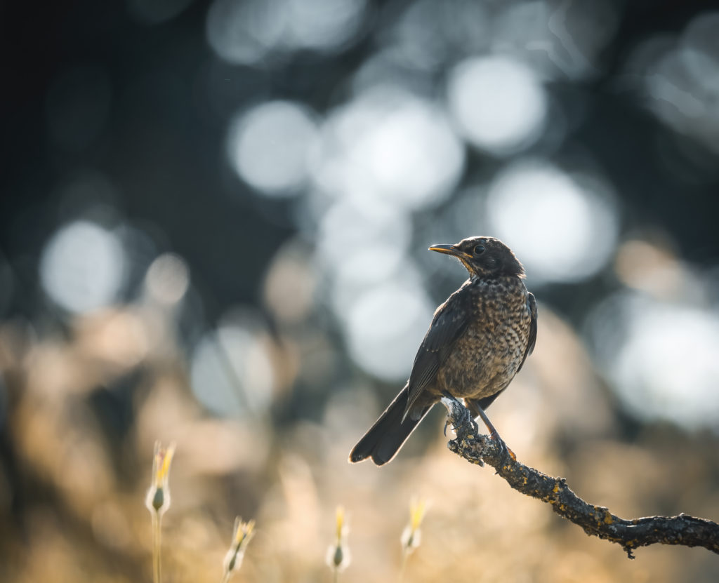 Alles klopt aan deze foto: de niet gecentreerde compositie, het lichtrandje rondom de lijster, de fraaie lichtvlekken in de achtergrond