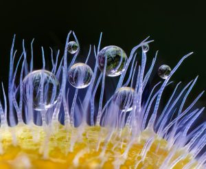 “Ik maakte deze macrofoto in de vroege ochtend, vlak na een regenbui. De druppels op de bloemhaartjes fascineerden mij enorm. Uiteindelijk heb ik op mijn computer een foto-stack (het overelkaar leggen van dezelfde opnames met telkens een iets ander scherptepunt) van 45 opnames gemaakt met dit als resultaat.”