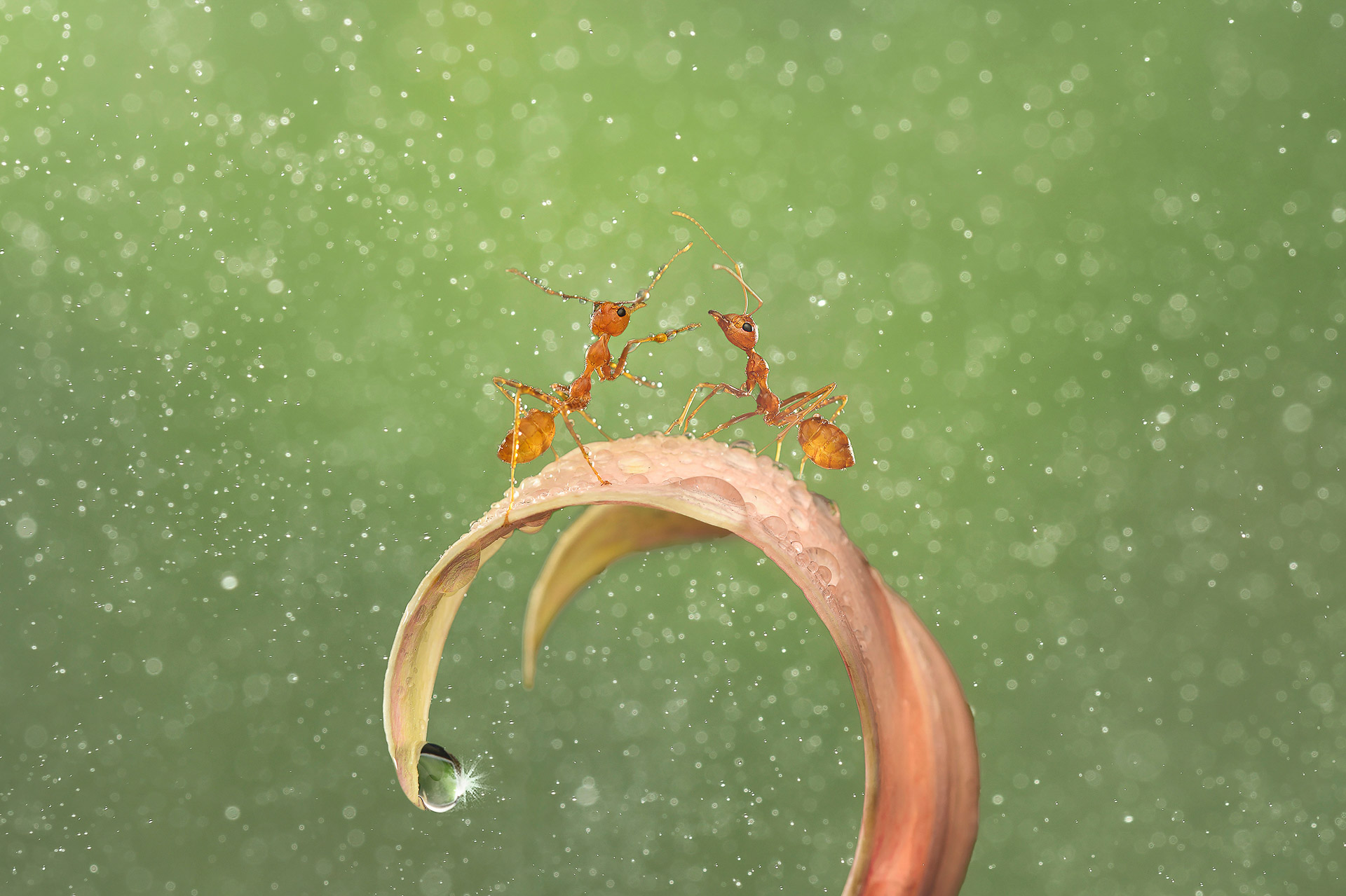 “In een kleine tuin op Hong Kong Island leken deze twee individuele mieren blij elkaar te ontmoeten. Ondanks de regenachtige omgeving.”
