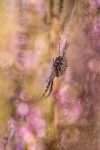 “Deze vrouwelijke wespspin wachtte geduldig op haar volgende slachtoffer. Tegen een achtergrond van roze bloeiende heide legde ik deze spin vast.”