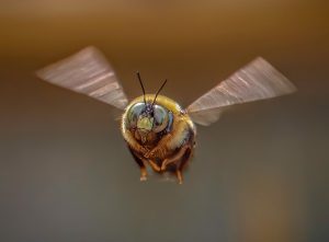 “Deze grote bij hing een tijdje rond op ons terras. Ik wilde proberen of ik er tijdens de vlucht een foto van kon maken met vage vleugels (door de beweging) en een scherp lijf. Het duurde bijna een middag, maar uiteindelijk kreeg ik deze foto waar ik blij mee ben.”