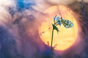 Vorig jaar was een van mijn doelen om een ​​oranjetipje te fotograferen voor de opkomende zon. In het Duits wordt deze vlinder Aurora genoemd – naar de godin van de dageraad. Op deze dag waren de omstandigheden perfect. Ik vond een oranjetipje voor zonsopgang. Het was een beetje winderig maar met een hogere ISO-instelling was dat geen probleem. En de opkomende zon werd gedimd door Sahara-stof in de lucht.”