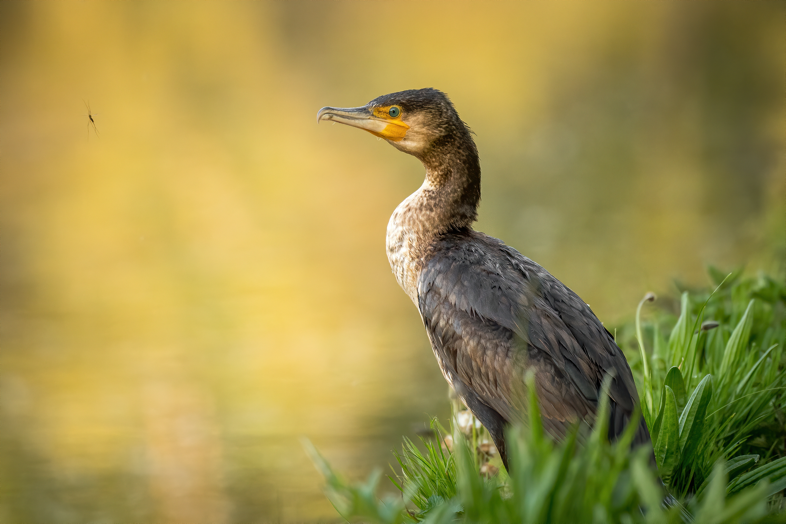 Aalscholver bij avondval • Jan Meeus – Het mooie avondlicht geeft een warme sfeer aan de foto. Het oranje van de snavel combineert goed met het oker in de achtergrond.
