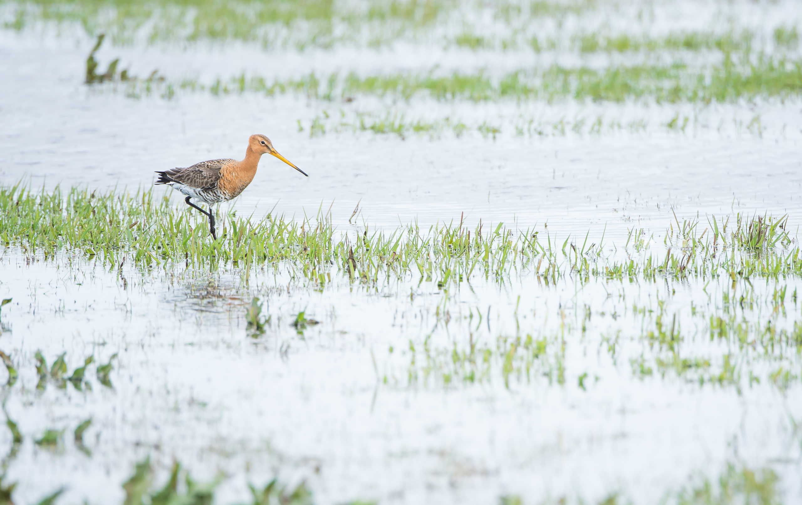 Grutto • Danny Slijfer – Perfecte plaat van een grutto in zijn habitat. De grassprieten in het water zorgen voor een mooi grafisch beeld.