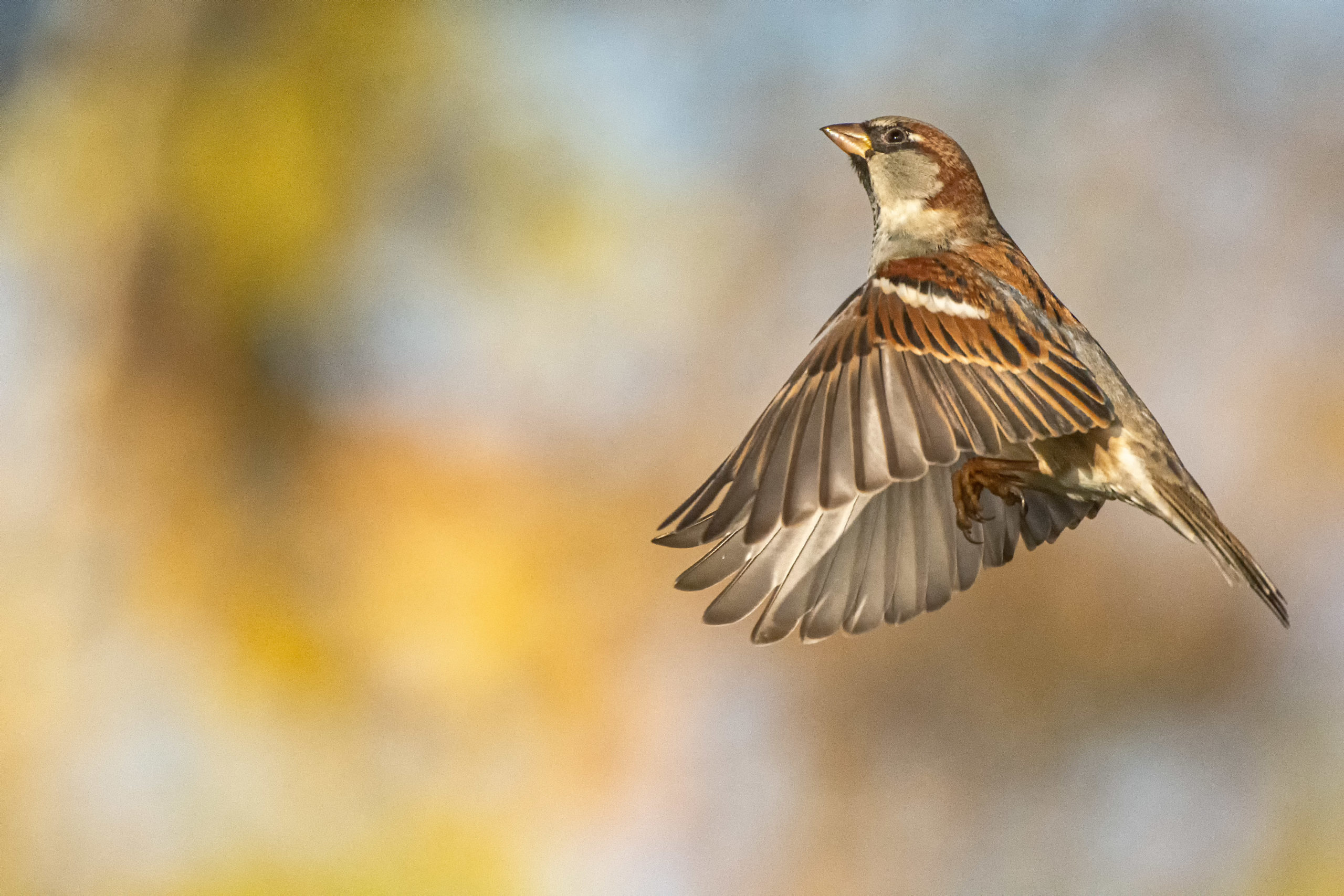 Huismus • Peter van Wieringen – Perfecte actieplaat, die een geheel andere kijk op de mus oplevert. De gelige achtergrond zorgt voor extra spanning in het beeld.