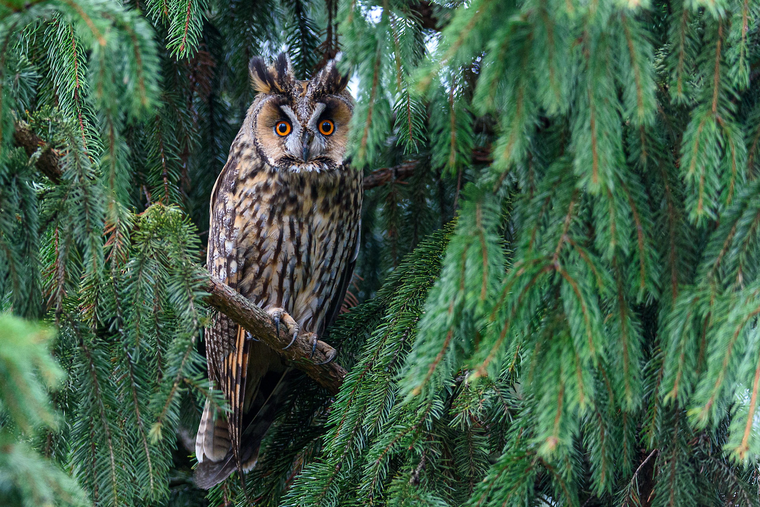 Ransuil • Peter van Wieringen – De hangende sparrentakken vormen een fraaie eenheid met het verenpatroon van de uil. De zichtbare lucht in de achtergrond zorgt ervoor dat de foto voldoende diepte heeft gekregen.