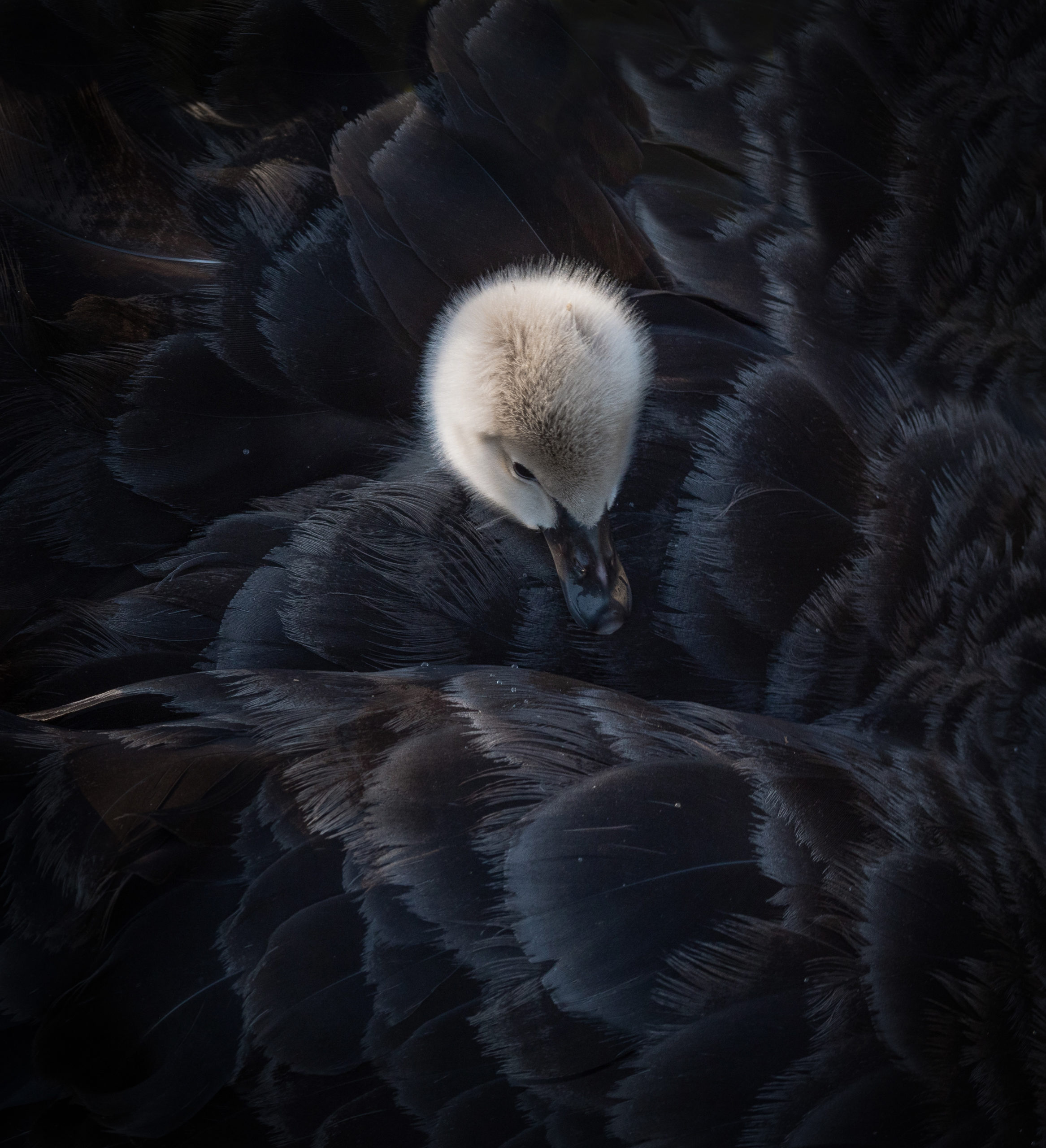 Staysafe • Maddy van der Pas – Aandoenlijk portret van een babyzwaantje op moeders verendek. Het licht is mooi zacht, daardoor is het wit van het jonge diertje niet overbelicht en zijn de zwarte vleugels mooi doortekend.
