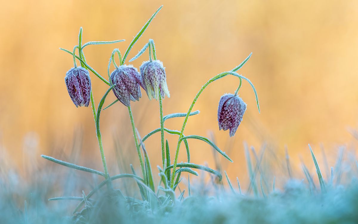 “Vroeg in de ochtend in half april was dit kleine groepje kievitsbloemen (Fritillaria) nog bedekt met rijp, in het natuurreservaat Silsombos in België. De opkomende zon verlichtte de achtergrond al, en wekte de delicate bloemen zo weer tot leven.”