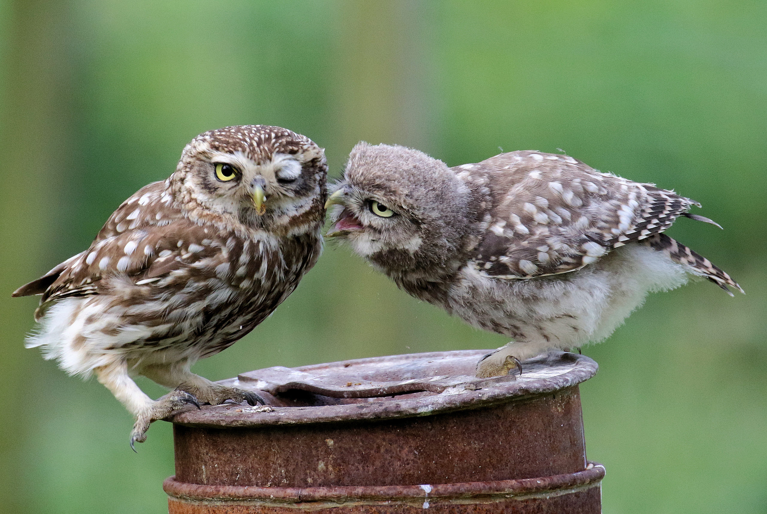 Kinderen die vragen, worden overgeslagen – Monique van Kootwijk. Mooie interactie. De vage groene achtergrond zorgt ervoor dat alle aandacht naar de uilen gaat.