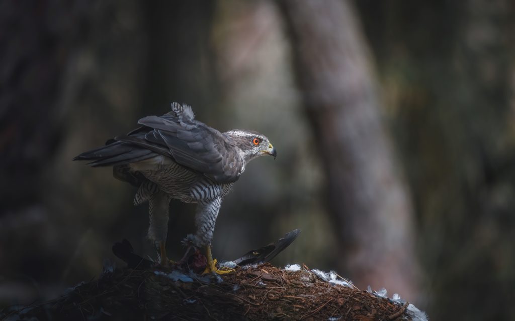 De perfecte lichtval maakt deze foto heel bijzonder. Mooi ook dat er in het schaduwgedeelte nog genoeg te zien is van het achterlijf. De fraaie details, zoals het oranje oog en de witte veertjes in een booglijn op de grond, maken de foto áf.