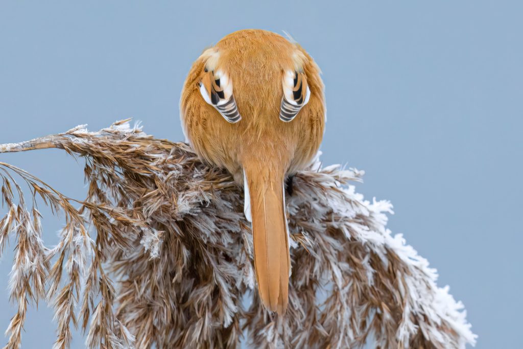 Met mooi licht en een goede (gecentreerde) compositie is deze futen-intimiteit perfect in beeld gebracht. De oranje kopveren komen prachtig uit tegen de grijze achtergrond.