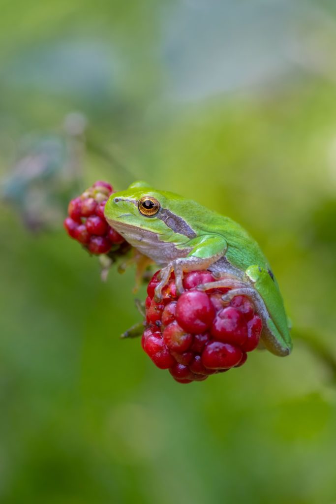 Het kleurcontrast máákt deze foto. Met een braam voor en achter de kikker is er een mooie diepte ontstaan.