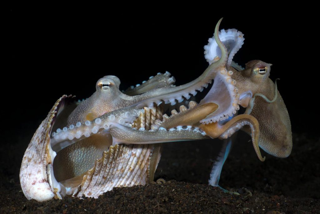 In de zee bij Tulamben, aan de noordoostkust van Bali, paren twee kokosnootoctopussen.