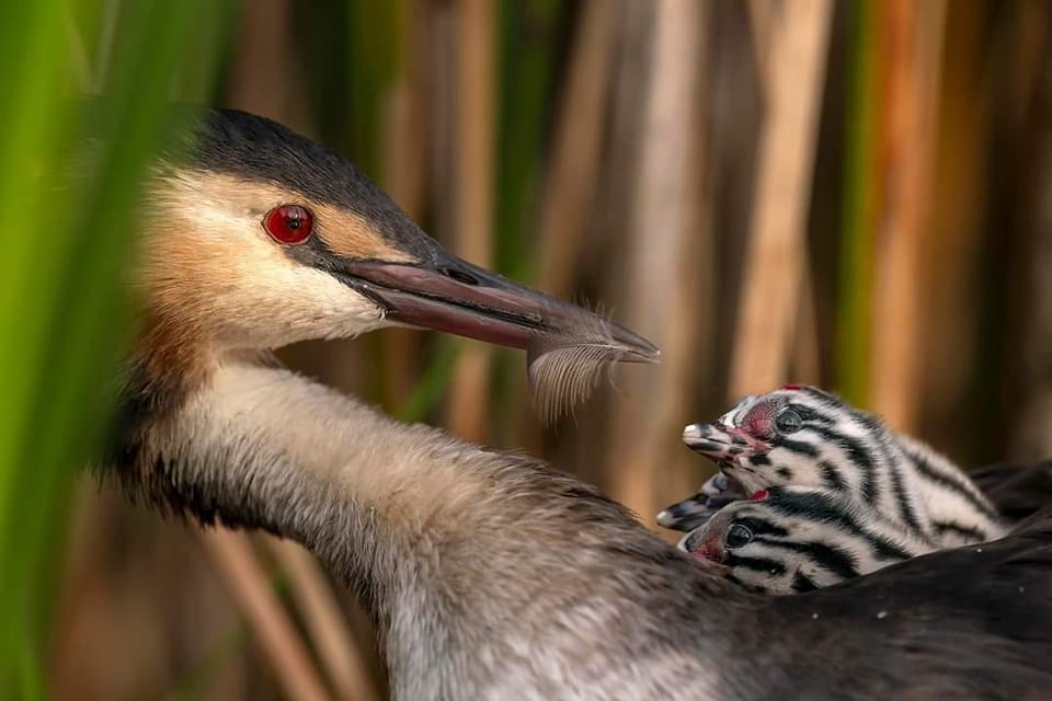 Fuut met kleintjes – David Pattyn. De Nederlandse fotograaf (en jurylid van de Roots Natuurfotowedstrijd) maakte deze foto in het Valkenhorst natuurreservaat bij Valkenswaard. Eervolle vermelding categorie Vogels.