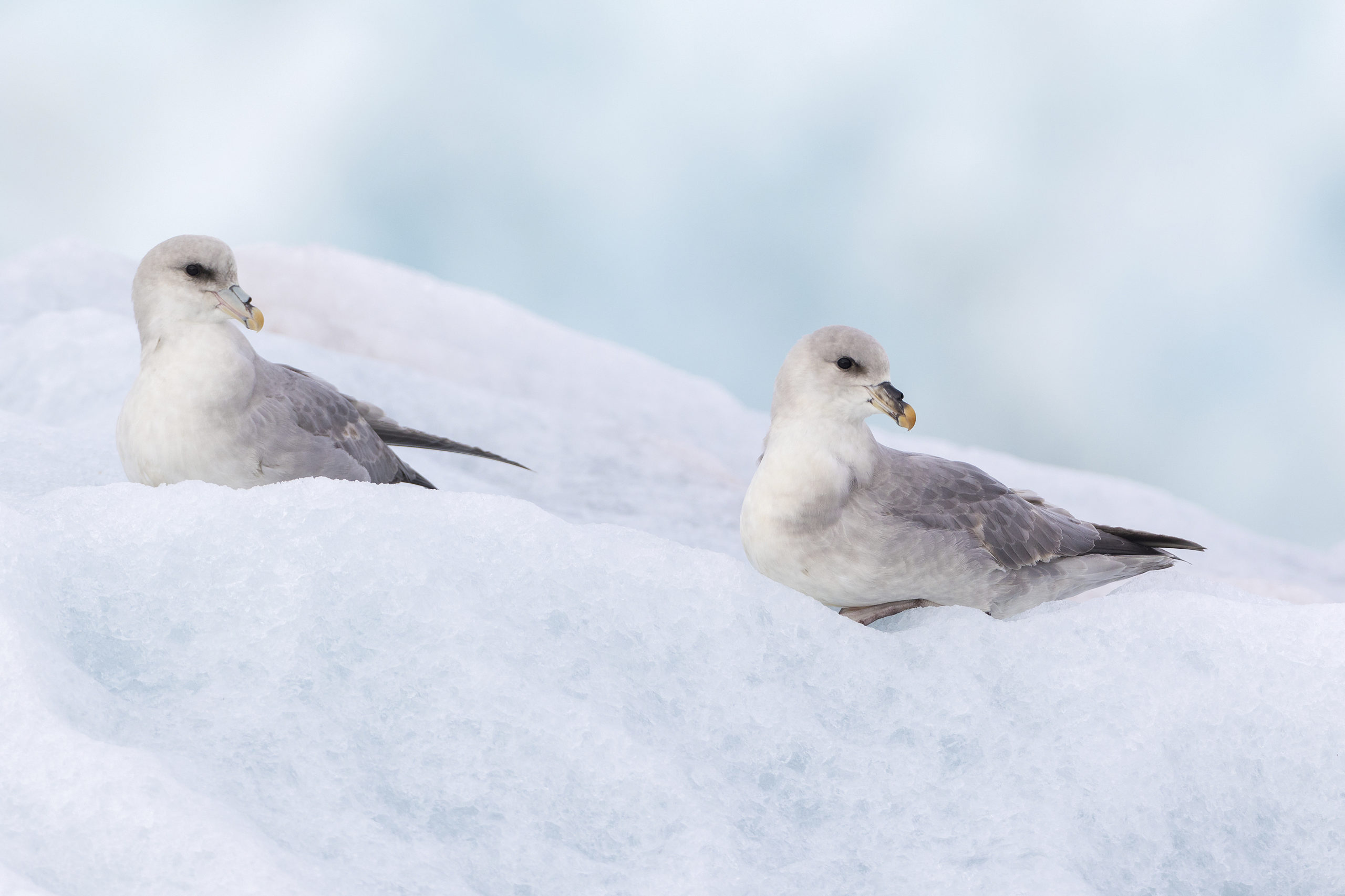 “Een prachtig paartje noordse stormvogels (de donkere vorm) op een ijsschots voor de Von-Post gletsjer”