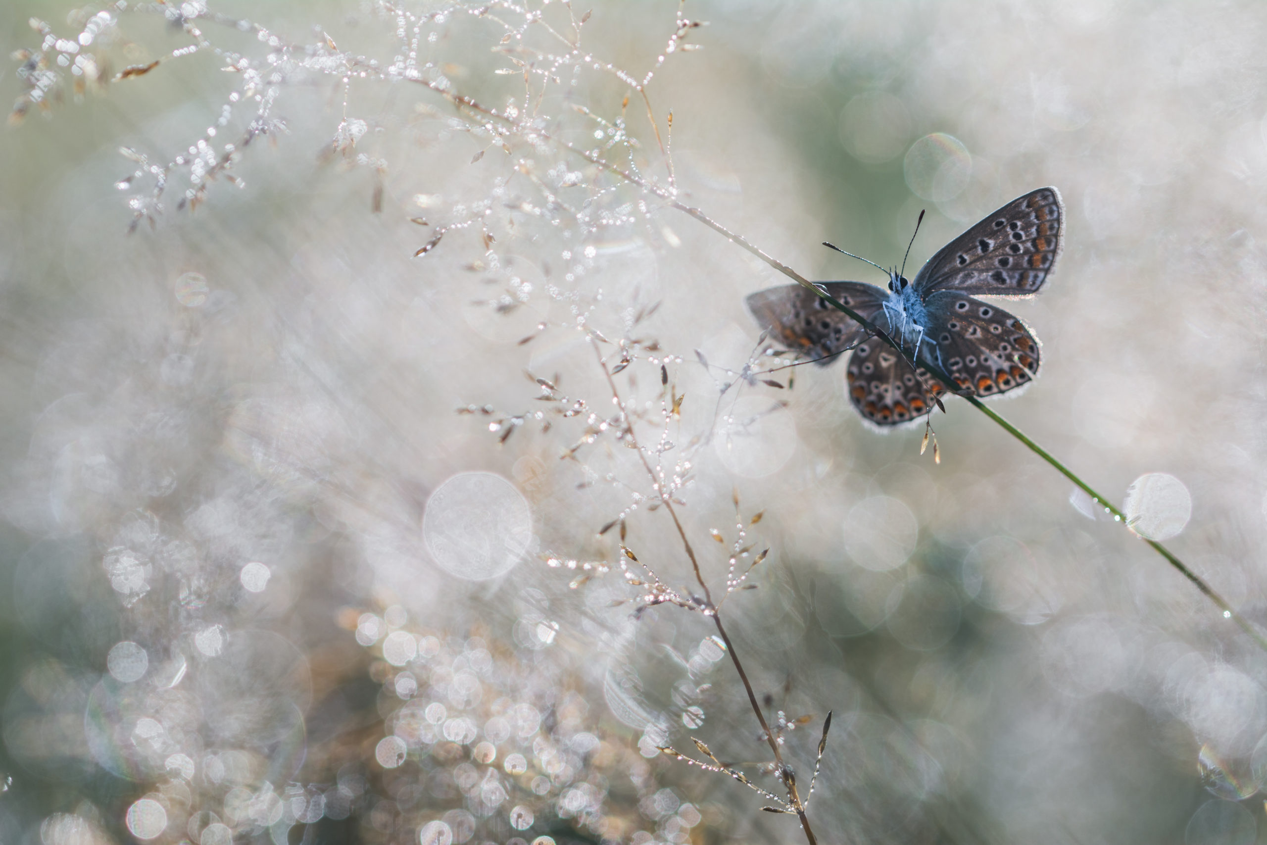 Gedeelde tweede plaats categorie Insecten. Blauwtje in een veld met dauw – Marion Hogendijk.