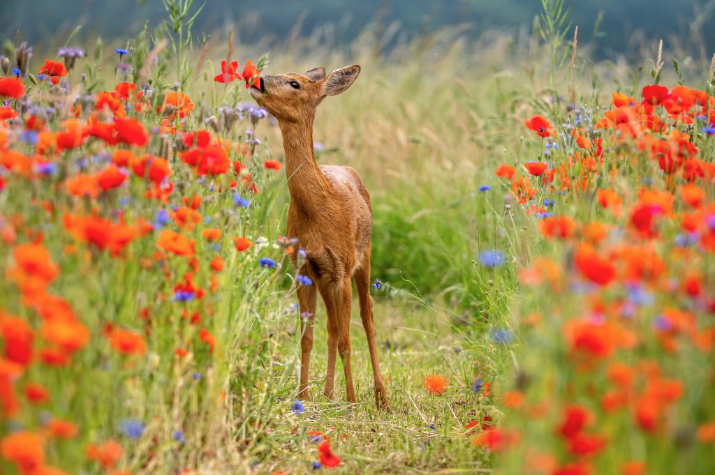 Aan deze foto klopt alles. De prachtige houding van de ree, de actie (van het snoepen), het fraai in beeld gebrachte veld met klaprozen en korenbloemen, de net-niet-symmetrie, het zachte licht en het lage standpunt van de fotograaf. Een leuk detail is ook het grassprietje voor de hals van de ree, een kleine fotografische imperfectie die de foto nog beter maakt.