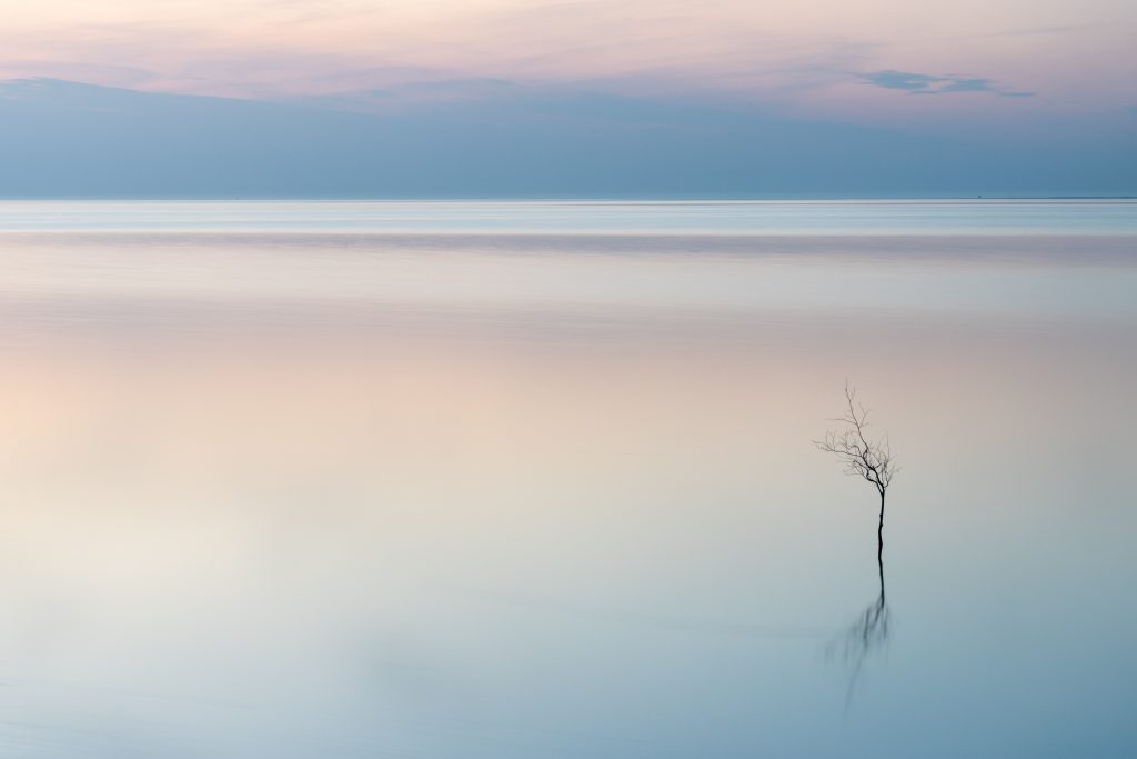 Wat een sfeer in deze foto! De zachte tinten en de rustige zee zorgen voor totale zen-beleving. De lange sluitertijd (van 20 seconden) zorgt ervoor dat de toch al rustige zee een extra zachte, melkachtige structuur heeft gekregen.